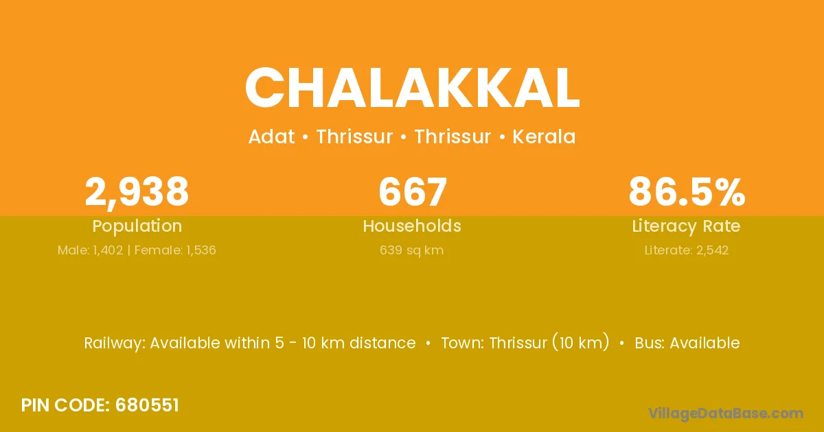 Thrissur (10 km) is the nearest town to Chalakkal village for major economic activities and is located approximately 10 km away.