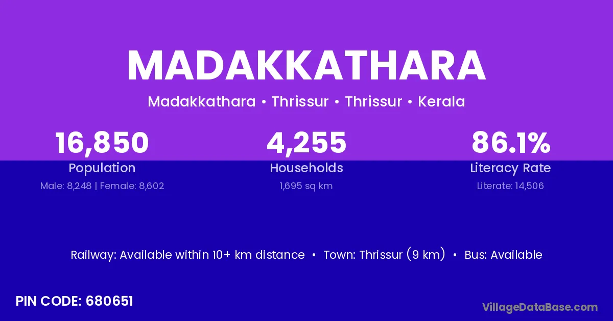 Madakkathara village has a total population of 16,850 people, of which 8,248 are males and 8,602 are females.