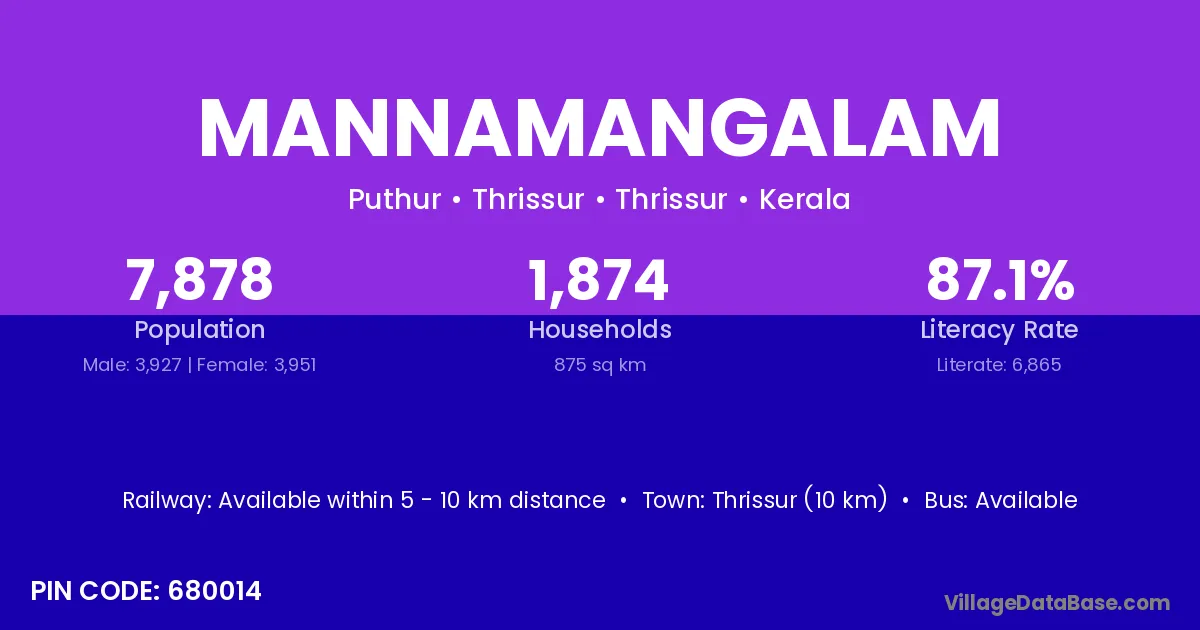Mannamangalam village has a total population of 7,878 people, of which 3,927 are males and 3,951 are females.