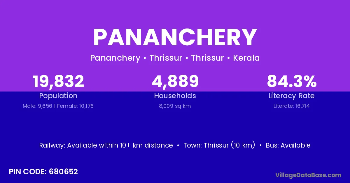 Thrissur (10 km) is the nearest town to Pananchery village for major economic activities and is located approximately 10 km away.