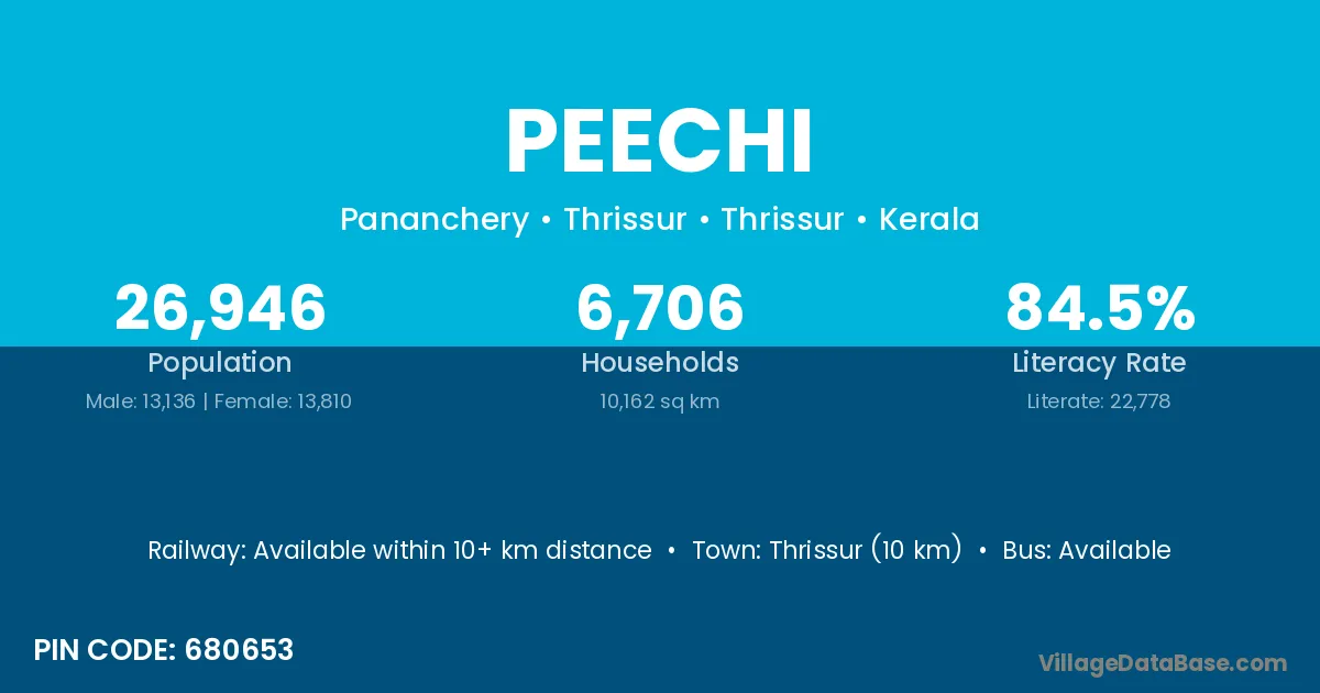 Thrissur (10 km) is the nearest town to Peechi village for major economic activities and is located approximately 10 km away.