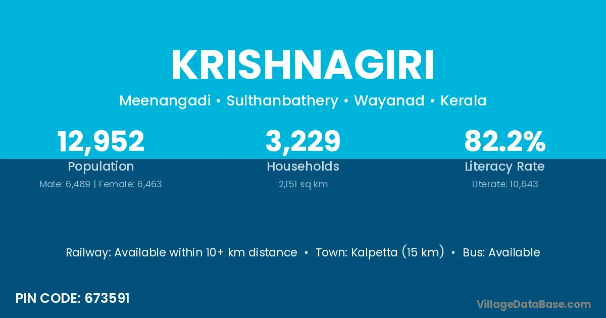 Kalpetta (15 km) is the nearest town to Krishnagiri village for major economic activities and is located approximately 15 km away.