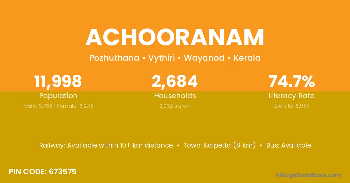 Kalpetta (8 km) is the nearest town to Achooranam village for major economic activities and is located approximately 8 km away.