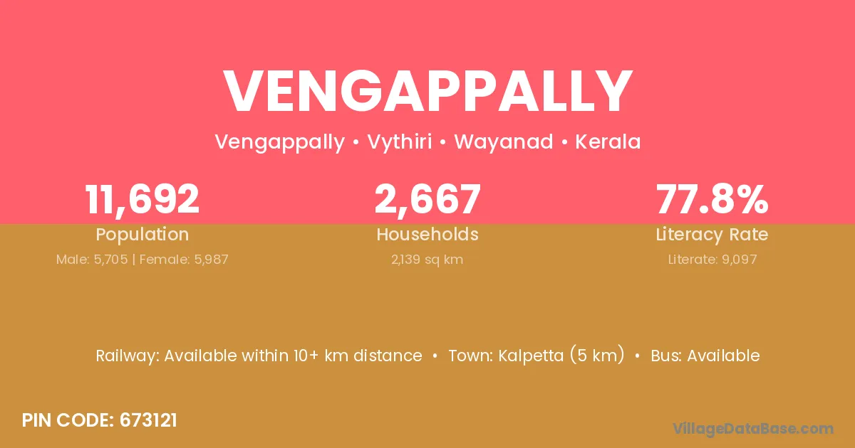Kalpetta (5 km) is the nearest town to Vengappally village for major economic activities and is located approximately 5 km away.