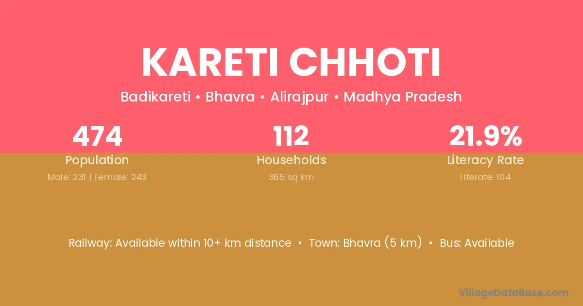 Kareti Chhoti village has a total population of 474 people, of which 231 are males and 243 are females.