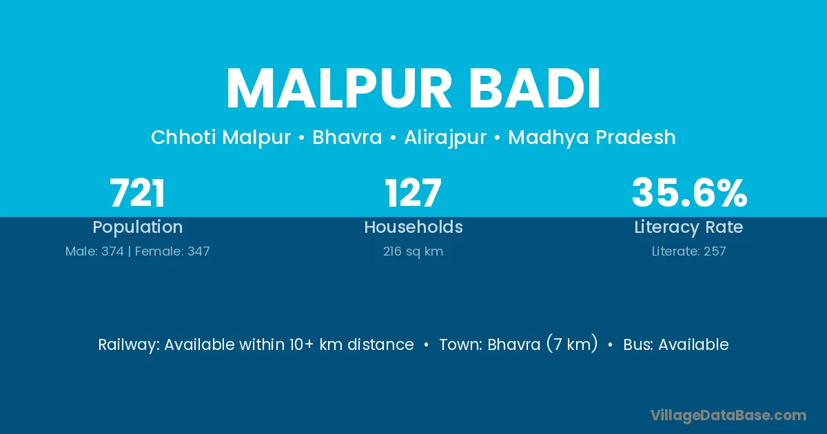 Bhavra (7 km) is the nearest town to Malpur Badi village for major economic activities and is located approximately 7 km away.
