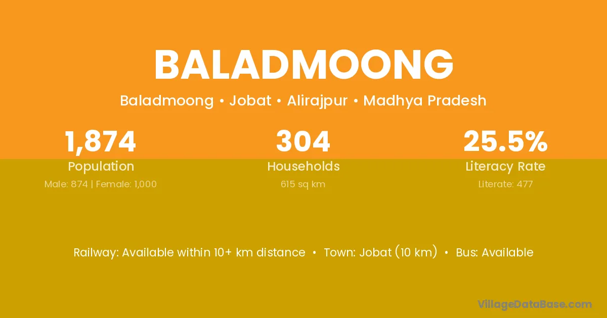 Jobat (10 km) is the nearest town to Baladmoong village for major economic activities and is located approximately 10 km away.