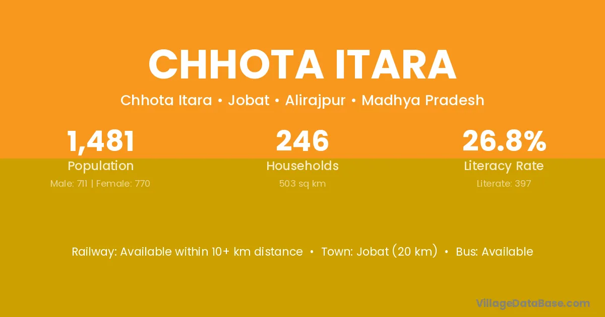 Jobat (20 km) is the nearest town to Chhota Itara village for major economic activities and is located approximately 20 km away.