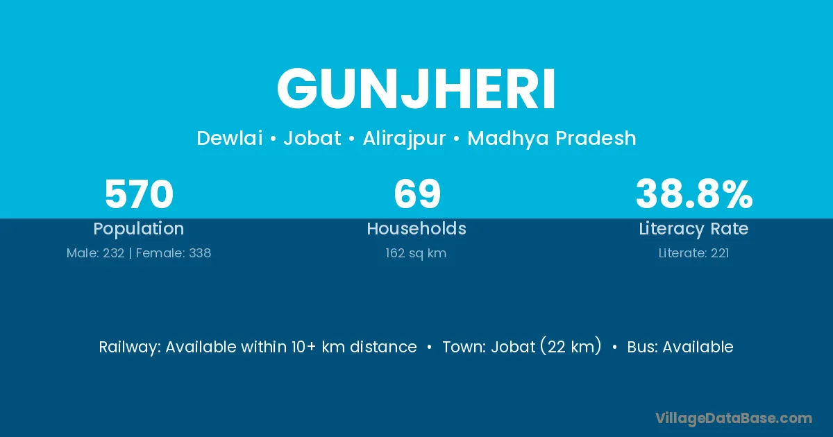 Jobat (22 km) is the nearest town to Gunjheri village for major economic activities and is located approximately 22 km away.