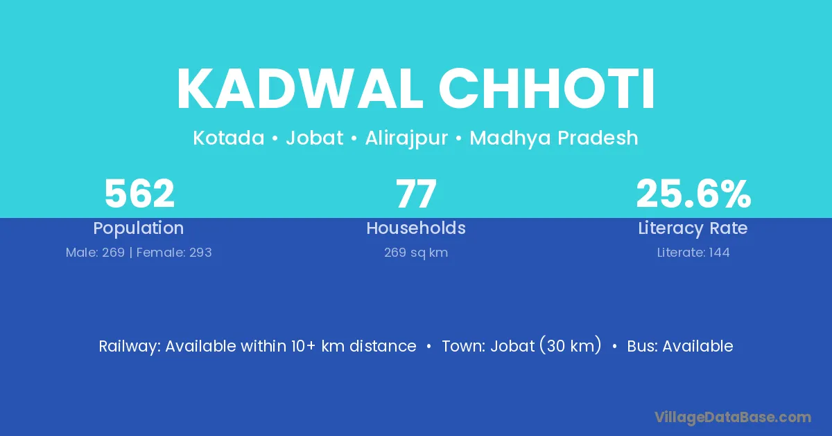 Jobat (30 km) is the nearest town to Kadwal Chhoti village for major economic activities and is located approximately 30 km away.