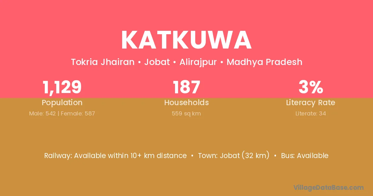 Jobat (32 km) is the nearest town to Katkuwa village for major economic activities and is located approximately 32 km away.