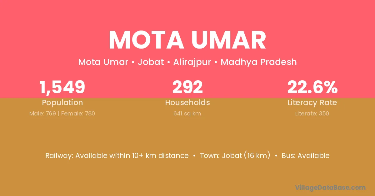 Jobat (16 km) is the nearest town to Mota Umar village for major economic activities and is located approximately 16 km away.