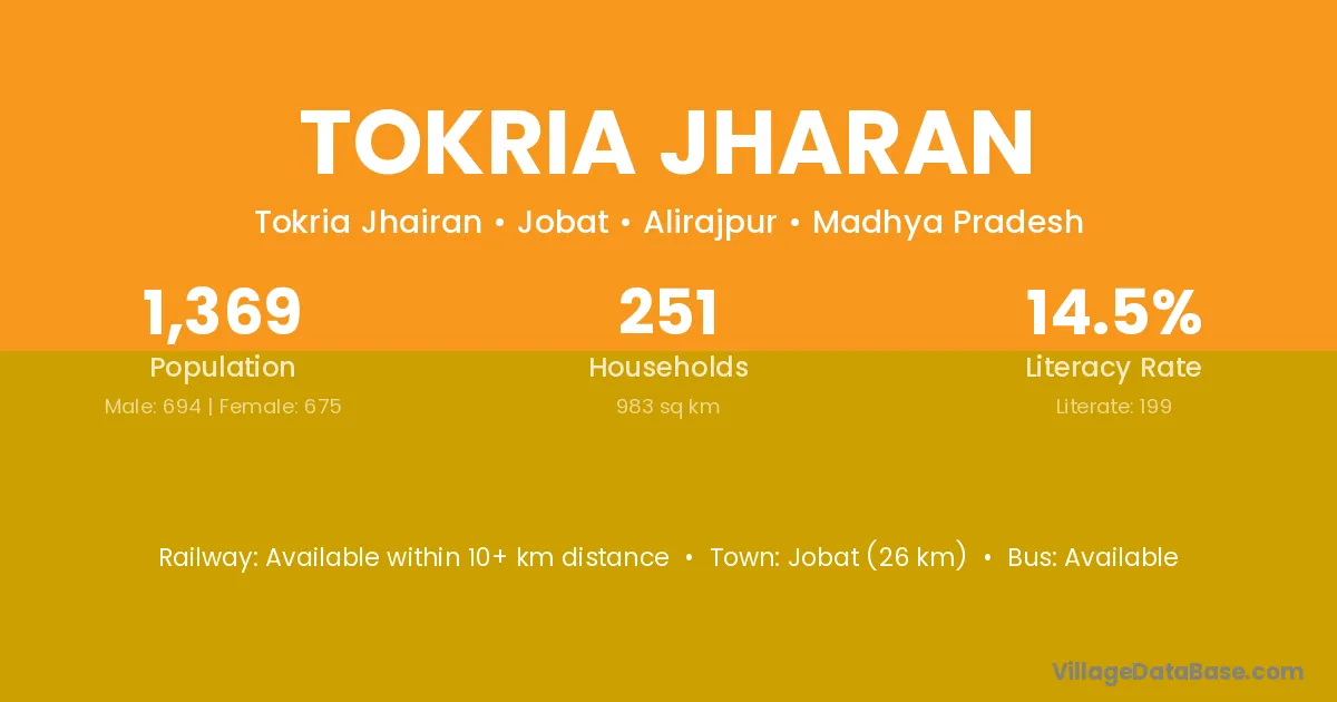 Jobat (26 km) is the nearest town to Tokria Jharan village for major economic activities and is located approximately 26 km away.