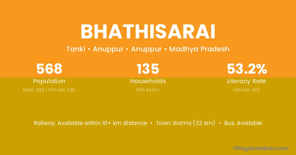 Kotma (32 km) is the nearest town to Bhathisarai village for major economic activities and is located approximately 32 km away.
