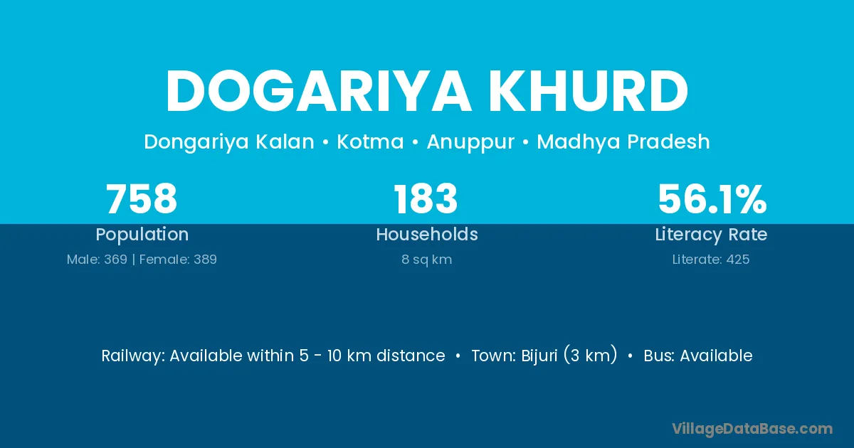 Dogariya Khurd village has a total population of 758 people, of which 369 are males and 389 are females.