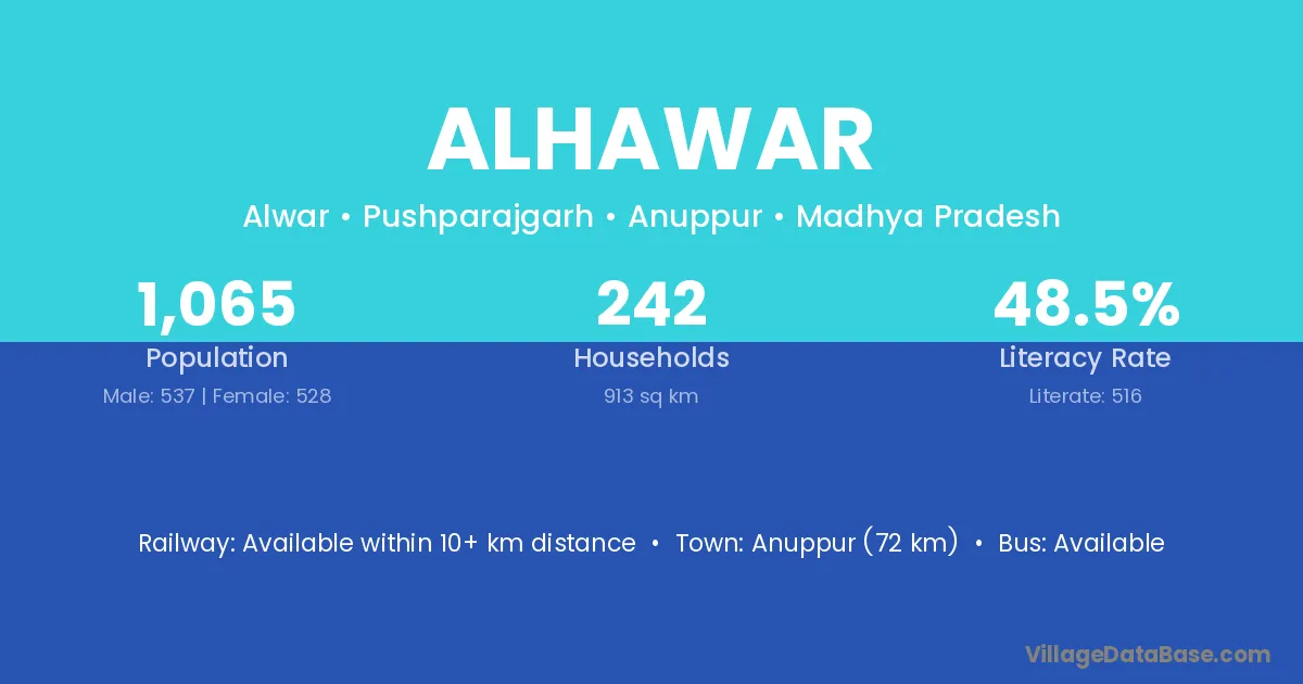 Anuppur (72 km) is the nearest town to Alhawar village for major economic activities and is located approximately 72 km away.