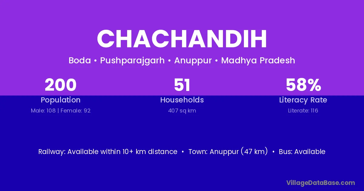 Anuppur (47 km) is the nearest town to Chachandih village for major economic activities and is located approximately 47 km away.