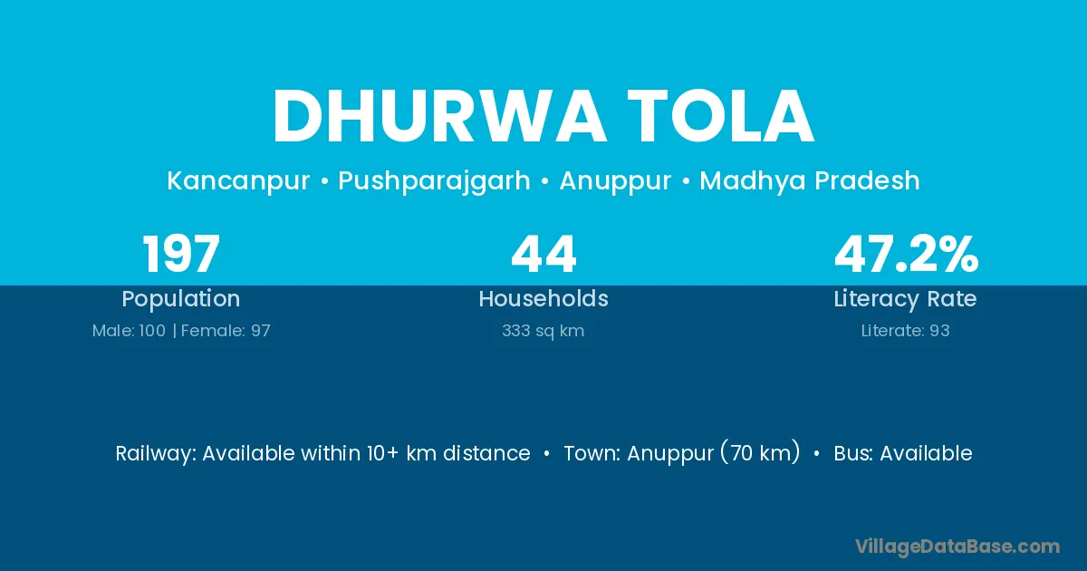 Anuppur (70 km) is the nearest town to Dhurwa Tola village for major economic activities and is located approximately 70 km away.