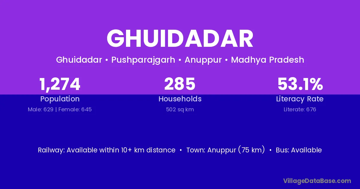 Anuppur (75 km) is the nearest town to Ghuidadar village for major economic activities and is located approximately 75 km away.
