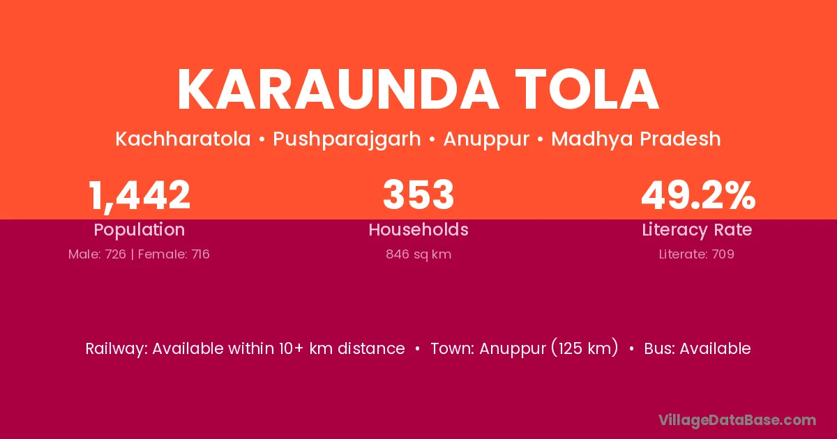 Anuppur (125 km) is the nearest town to Karaunda Tola village for major economic activities and is located approximately 125 km away.