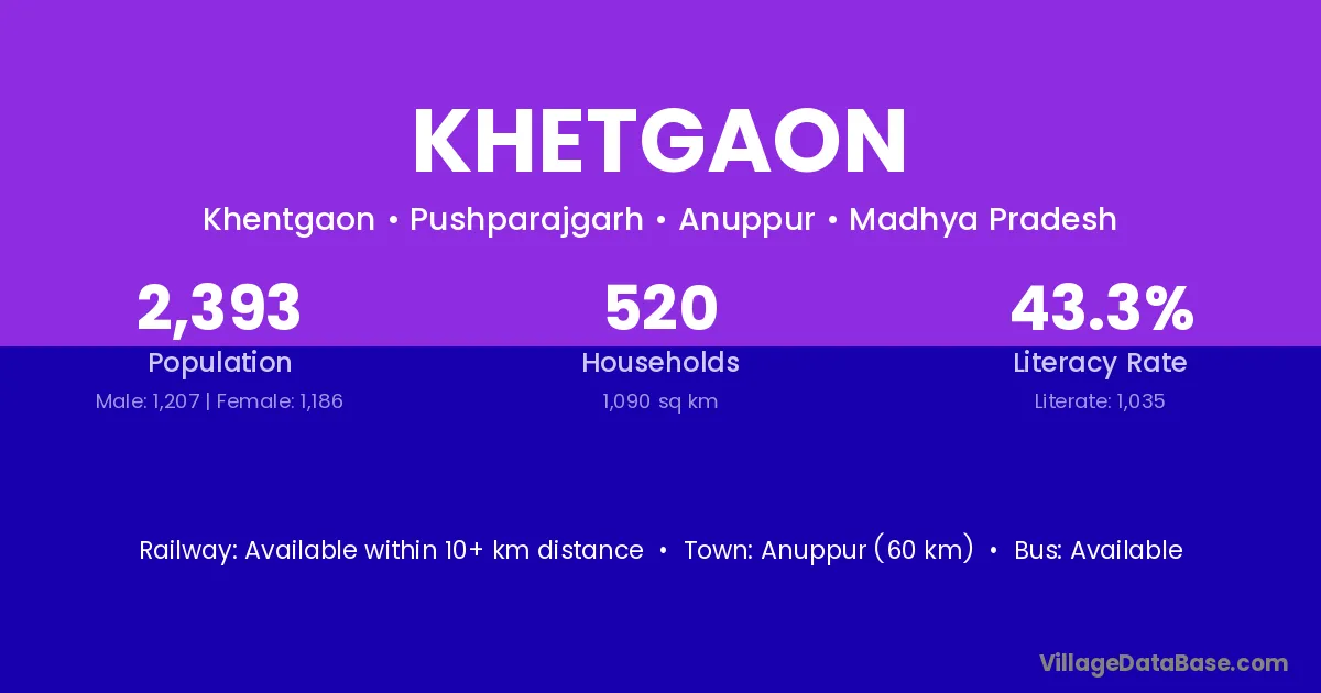 Anuppur (60 km) is the nearest town to Khetgaon village for major economic activities and is located approximately 60 km away.