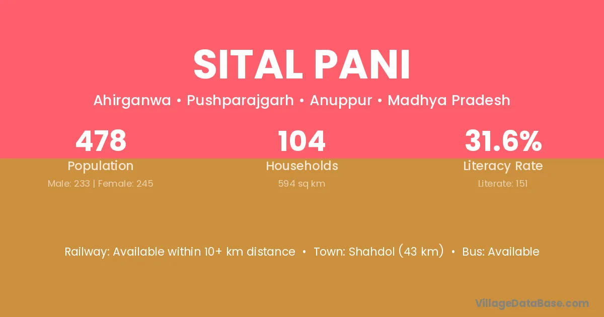 Shahdol (43 km) is the nearest town to Sital Pani village for major economic activities and is located approximately 43 km away.
