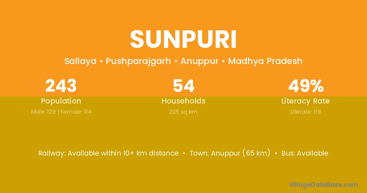 Sunpuri village has a total population of 243 people, of which 129 are males and 114 are females.