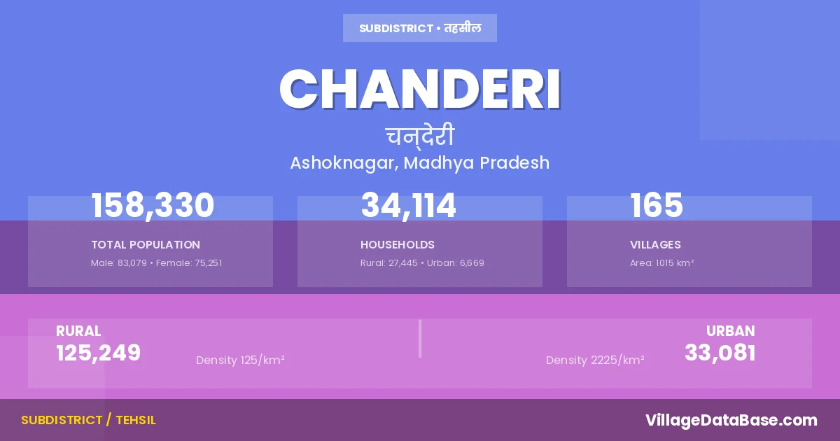 According to the 2011 census The total area of Chanderi Tehsil is 1015 km², with a population of 158330 people. The population density is 156 inhabitants per square kilometre, and there are approximately 34114 houses in the sub district.