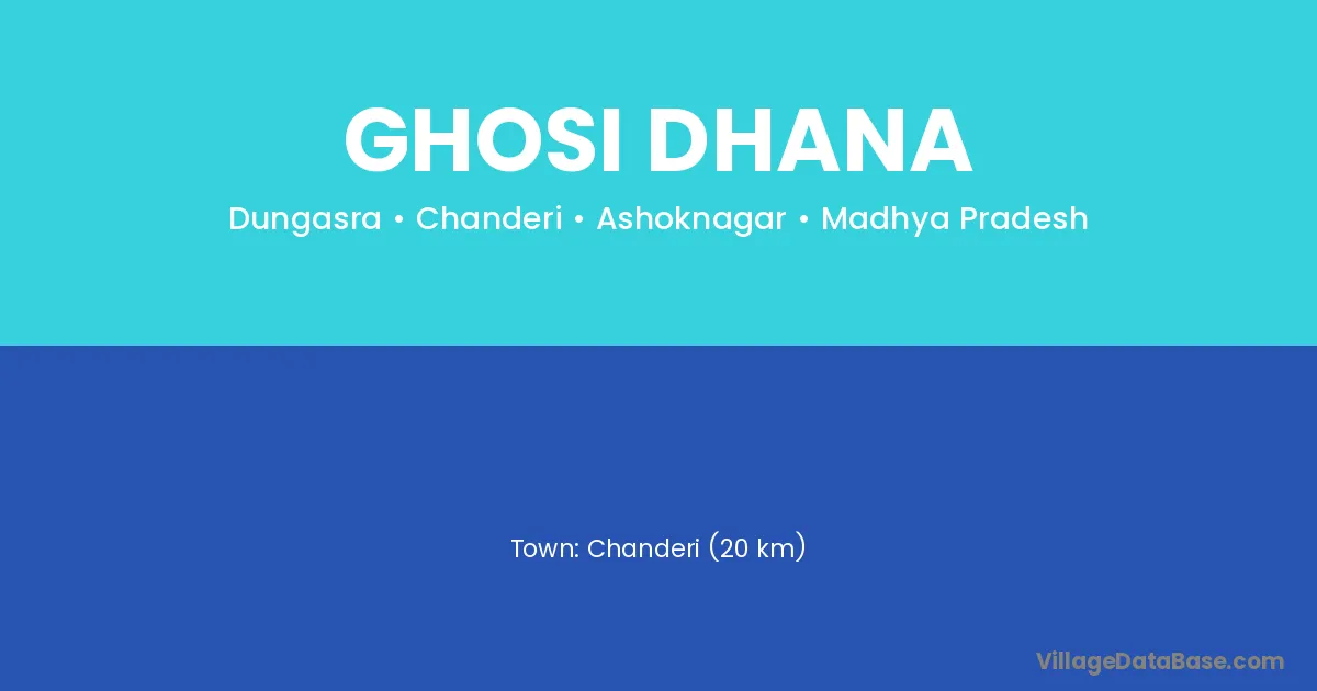 Chanderi (20 km) is the nearest town to Ghosi Dhana village for major economic activities and is located approximately 20 km away.