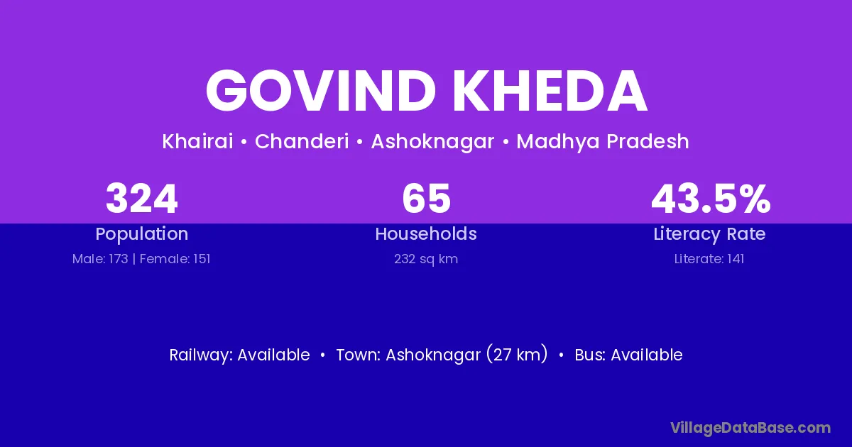 Ashoknagar (27 km) is the nearest town to Govind Kheda village for major economic activities and is located approximately 27 km away.
