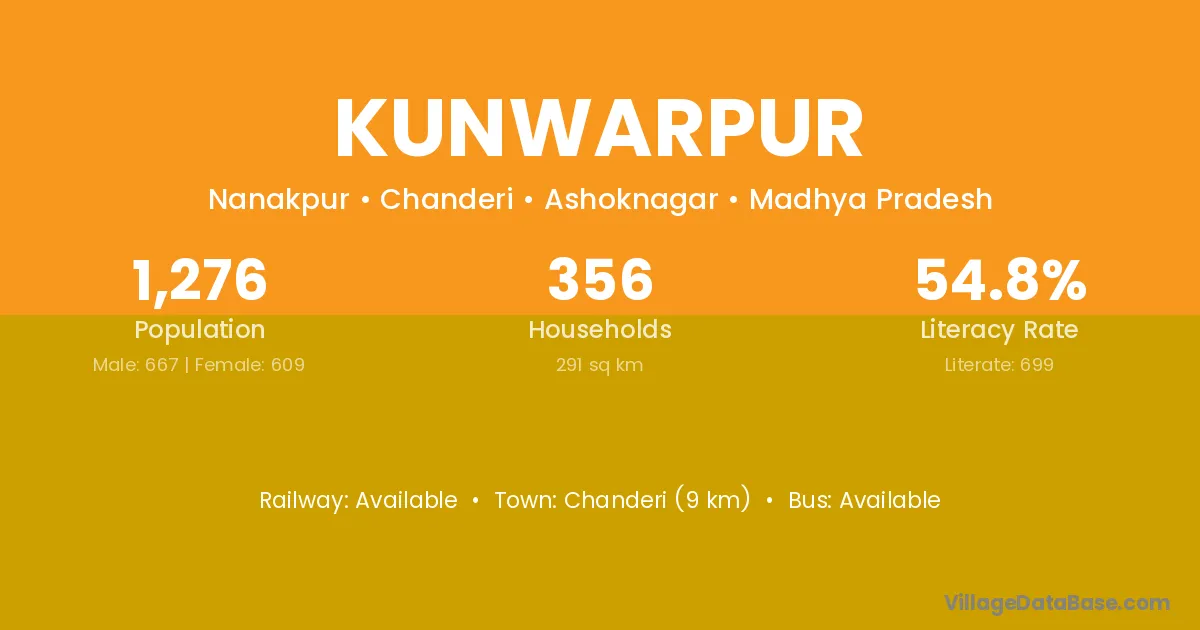 Chanderi (9 km) is the nearest town to Kunwarpur village for major economic activities and is located approximately 9 km away.