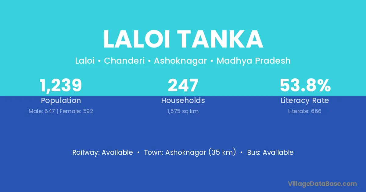 Ashoknagar (35 km) is the nearest town to Laloi Tanka village for major economic activities and is located approximately 35 km away.