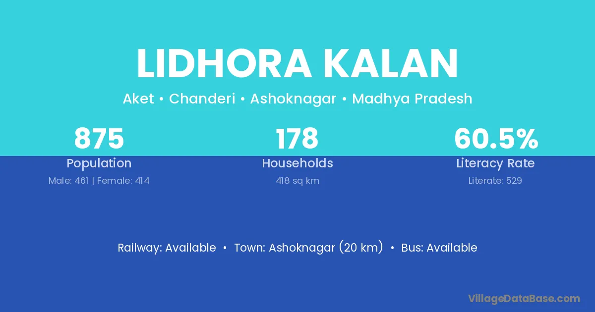 Ashoknagar (20 km) is the nearest town to Lidhora Kalan village for major economic activities and is located approximately 20 km away.