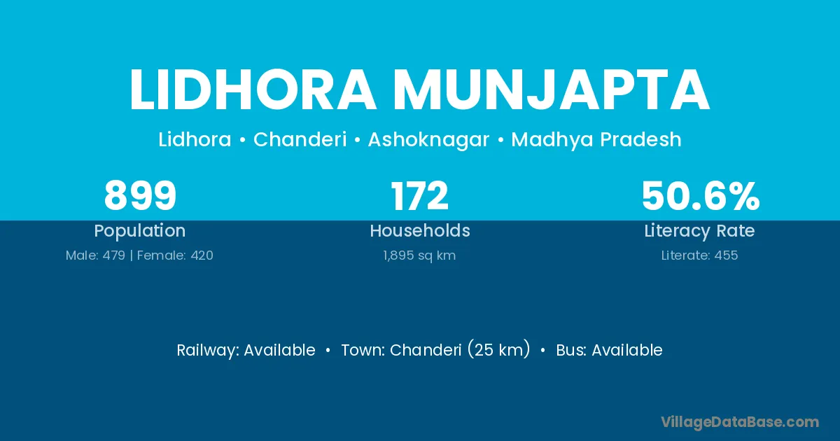 Chanderi (25 km) is the nearest town to Lidhora Munjapta village for major economic activities and is located approximately 25 km away.