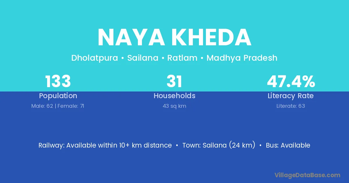 Chanderi (13 km) is the nearest town to Naya Kheda village for major economic activities and is located approximately 13 km away.