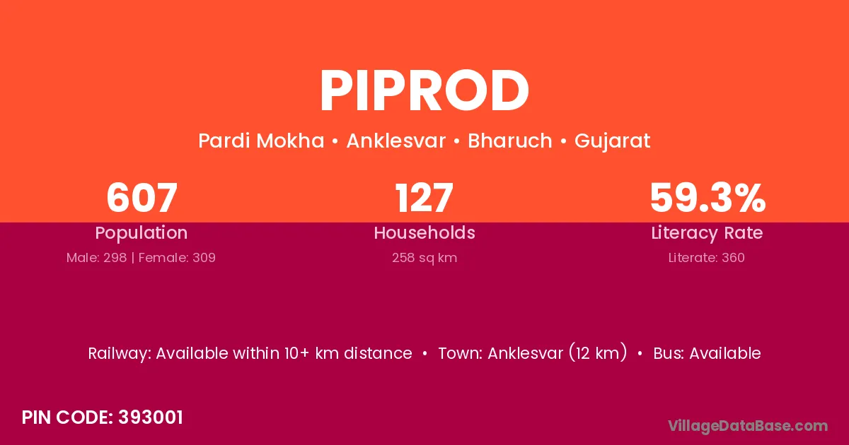 The literacy rate of Piprod village is 41.13%. Male literacy stands at 45.76% and female literacy at 36.86%.