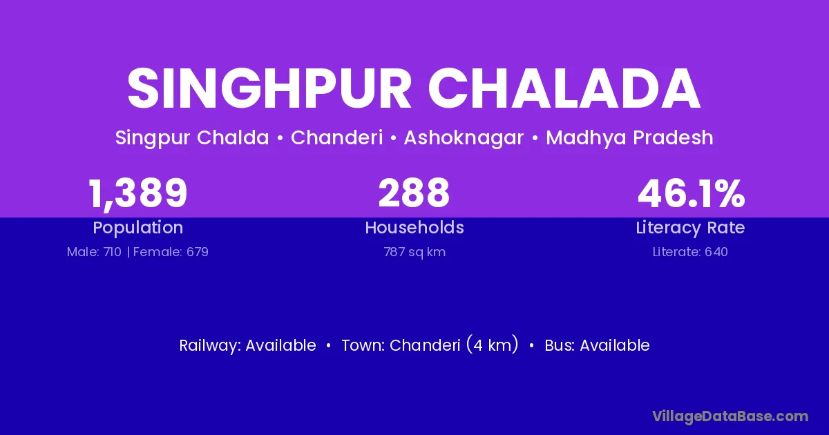 Singhpur Chalada village has a total population of 1,389 people, of which 710 are males and 679 are females.