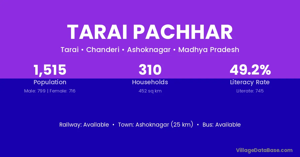 Ashoknagar (25 km) is the nearest town to Tarai Pachhar village for major economic activities and is located approximately 25 km away.
