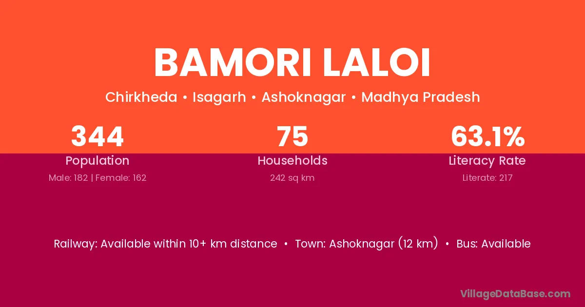 Ashoknagar (12 km) is the nearest town to Bamori Laloi village for major economic activities and is located approximately 12 km away.