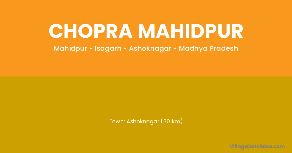 Ashoknagar (30 km) is the nearest town to Chopra Mahidpur village for major economic activities and is located approximately 30 km away.