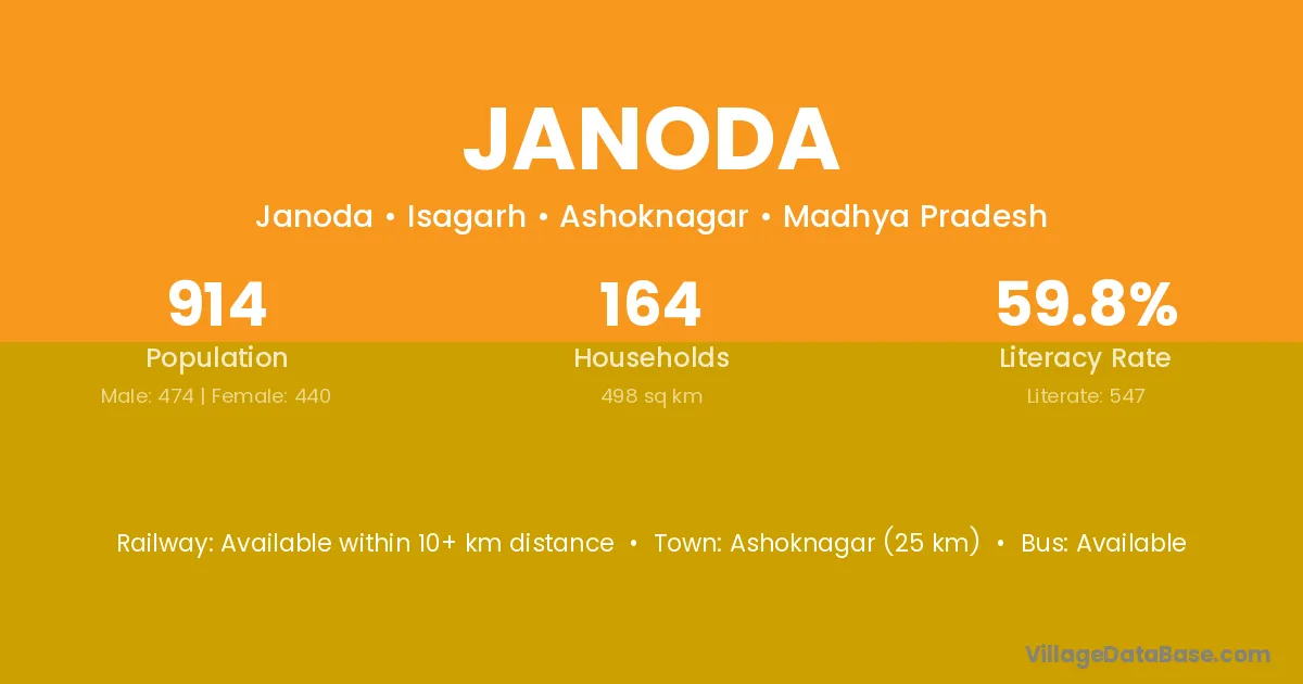 Ashoknagar (25 km) is the nearest town to Janoda village for major economic activities and is located approximately 25 km away.