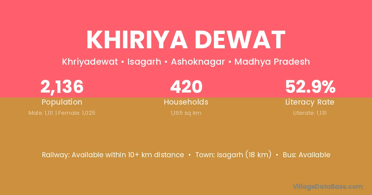 Isagarh (18 km) is the nearest town to Khiriya Dewat village for major economic activities and is located approximately 18 km away.