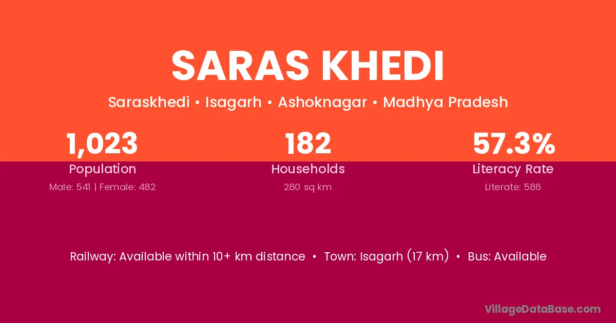 Saras Khedi village has a total population of 1,023 people, of which 541 are males and 482 are females.