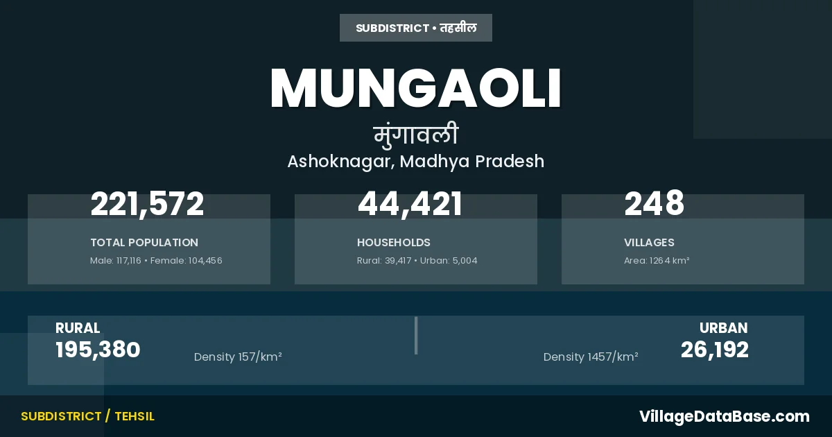 According to the 2011 census The total area of Mungaoli Tehsil is 1264 km², with a population of 221572 people. The population density is 175 inhabitants per square kilometre, and there are approximately 44421 houses in the sub district.