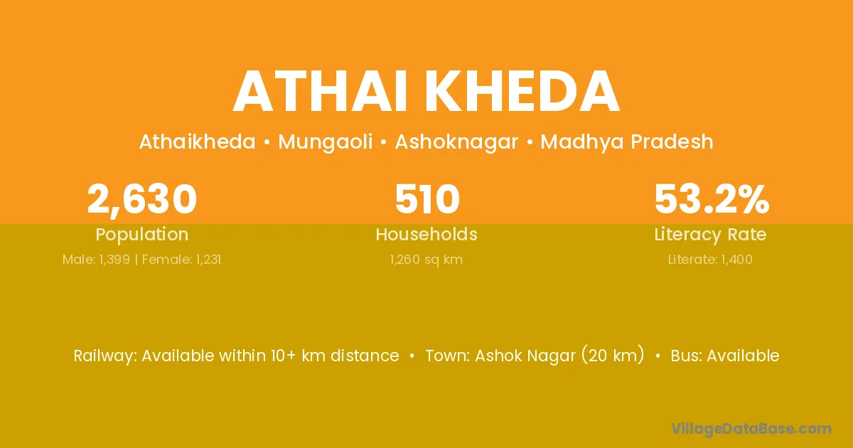 Ashok Nagar (20 km) is the nearest town to Athai Kheda village for major economic activities and is located approximately 20 km away.