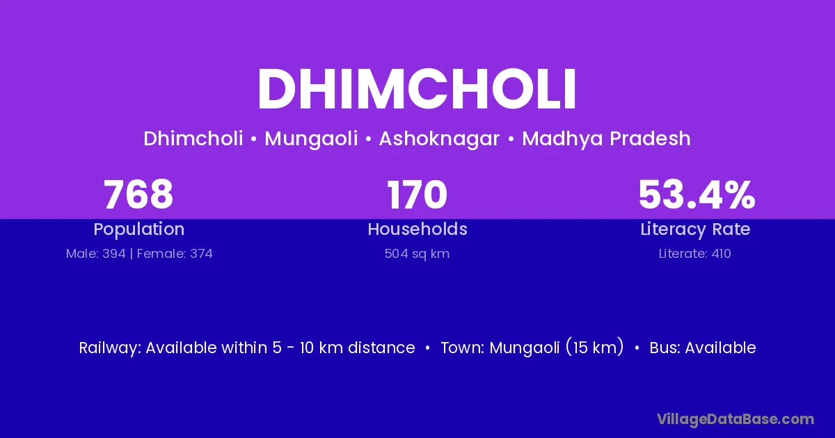 Mungaoli (15 km) is the nearest town to Dhimcholi village for major economic activities and is located approximately 15 km away.