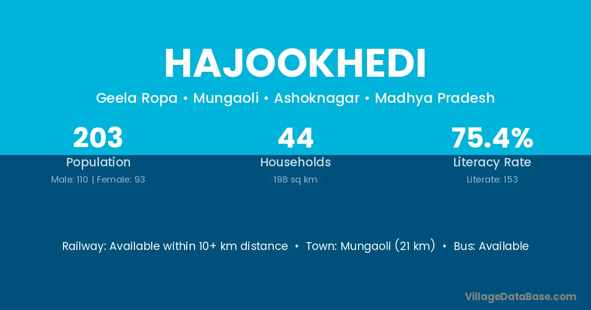 Mungaoli (21 km) is the nearest town to Hajookhedi village for major economic activities and is located approximately 21 km away.