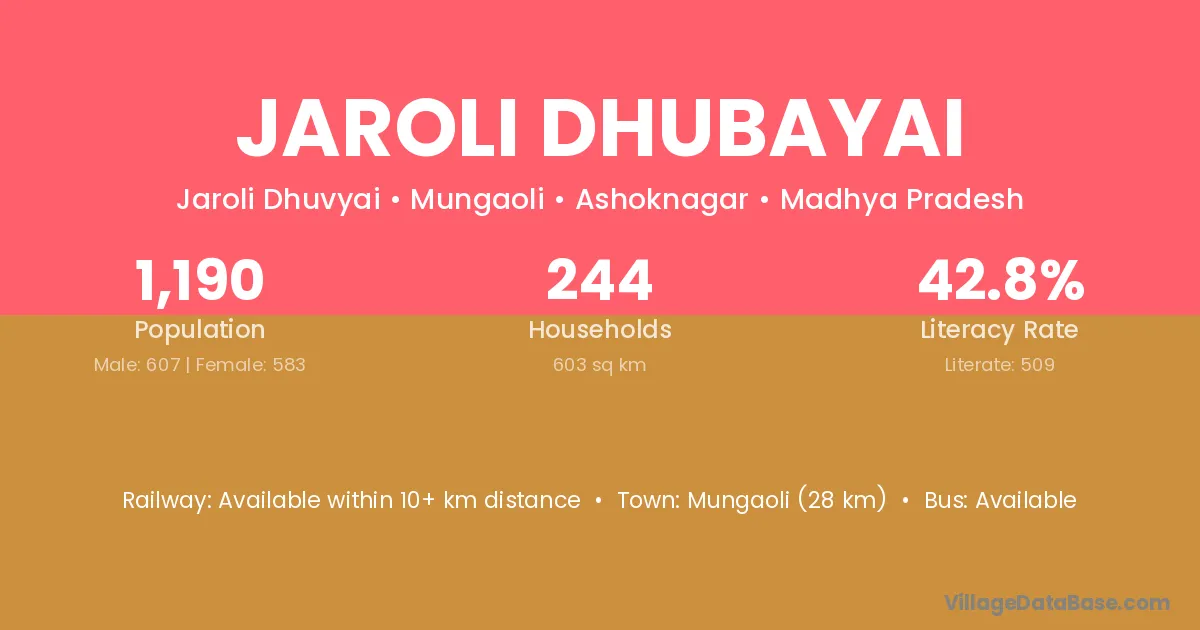 Mungaoli (28 km) is the nearest town to Jaroli Dhubayai village for major economic activities and is located approximately 28 km away.