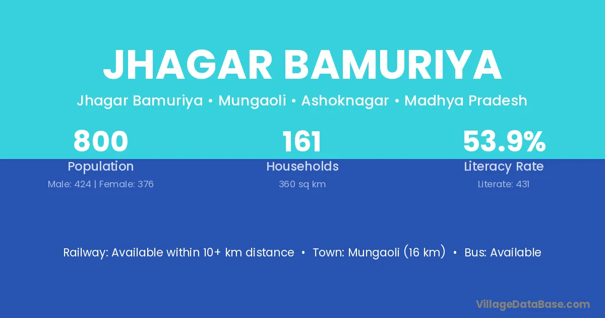 Mungaoli (16 km) is the nearest town to Jhagar Bamuriya village for major economic activities and is located approximately 16 km away.