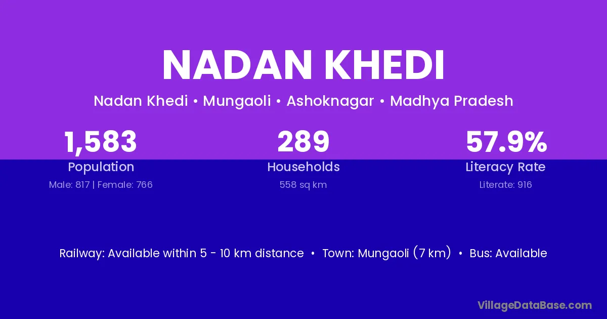Mungaoli (7 km) is the nearest town to Nadan Khedi village for major economic activities and is located approximately 7 km away.